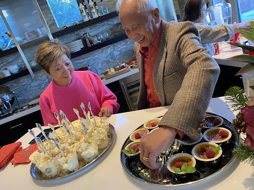 On the day of the event, Chef Cindy and her assistant, Chef Wadsworth, arrived in plenty of time and had the first dishes coming out right on time. They did all prep in the house kitchen, which is what I wanted, and brought the food out as it was ready so people could slowly enjoy the morsels over time. After the food was all cooked, Chef Cindy packed up the leftovers for us and she and her assistant made sure everything was spotless in the kitchen, including emptying all the trashes.