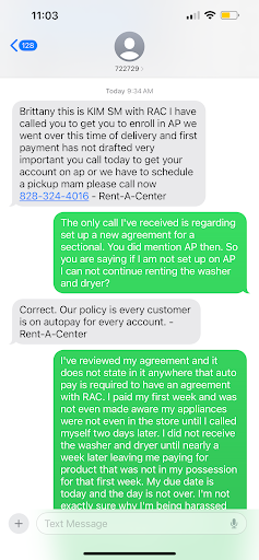 EDIT to add after my issue being brought to attention to the DM: He reached out and I expressed my main concern/issue being regarding the store manager essentially harassing me over the auto pay. He was zero help and is 100% not customer focused. He cuts me off multiple times, tells me he reviewed my screen shots posted here and said he did not see anything of where Kim told me they would pick my items up if I did not set up auto pay (lol it’s the first screenshot and was said multiple times) his demeanor was pretty rude throughout our conversation, continued to make excuses for Kim, and then cuts me off to seriously go into detail of the pros and cons of auto pay and why they suggest customers to have it and ask me “so is there a reason you don’t want to be set up on auto pay?” As if he is trying to sell me on it to seriously ask me about getting signed up on it again. I reiterated I do not wish to be on auto pay, and just flat out had to plainly ask “will my items be scheduled for pick up if I do not sign up on auto pay?” He says no they will not. I said okay great that’s all I needed to know and he said ok I hope you have a great day. Terrible representatives of RAC. I’ve had nothing but issues with RAC since I started my agreement. Late delivery, rude employees, failing to inform customers on what does and does not come with the product, denying their delivery driver/installer made any damages to my property, Fraudulent misrepresentation which is 100% illegal for a company to do.