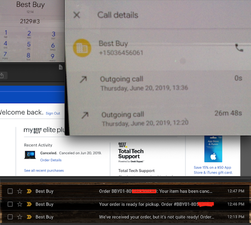 So I hang up the phone and go check my recent emails to verify my cancellation. In this small less than a minute time between the two emails, I see the golden email. The Pick up ready email, the first notification I received while on the phone with the remote CSR.. WAIT I just cancelled it and less than 1 minute prior while I was on the phone with you, while you called the store, while you verified my order number and then communicated with the store pickup desk you verified it was not available, it was actually READY FOR PICKUP! You literally just were on the phone with "them".