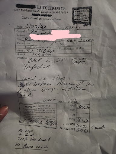 Read moreAwesome Experience! I could not have asked for an easier and more convenient repair. My 55" Samsung picture went out but still had sound. I googled "tv repair in Powder Springs" and found David in Hiram. I called him and explained the problem and he diagnosed it immediately and gave me a price to fix it. $160 was much cheaper than a new one! Short, sweet, affordable. I did think it a little strange at first to drop the TV off at the emissions place, but after hearing the D.O.T. bought and demolished the building he worked in right behind the emissions, and that he is now retired and doesn't want the headache or the overhead of a storefront, it made perfect sense. David fixed it in a few days and charged EXACTLY what he quoted me. I decided to pay him $20 extra to deliver, set up, and test the TV in my home. Well worth it. I can't recommend him more highly.