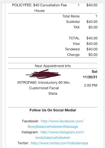 Worse experience, first i bout 2 massages, when arrived 40 minutes earlier, 5 minutes before the appointment they tell me they have to re schedule. From 4 pm to 8 pm, and they refused initially to give me money back, which eventually they did as other customers were arriving. I was called before the confirmation call, and alerted that if i didn't show up i would be charged $40 for a non show fee, and then 24 hs before, i receive an SMS which i confirmed.