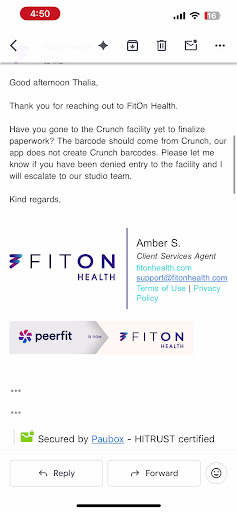 After that call, I emailed both my third-party provider and the manager, Tom. Less than 15 minutes later, Tom finally responded, saying that if I re-enroll, my account should be active within a day or two—and that I was free to come in and use the gym in the meantime. He also told me to set a monthly alarm so I don’t forget to check in with the third-party provider to avoid cancellation again, and emphasized that this is a FitOn policy, not Crunch’s.