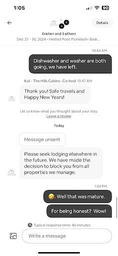 I gave a one star overall for this review simply because the company has banned me from all future stays with this company because I was honest about a four minor negative comments. See attached picture from their response to my initial survey.