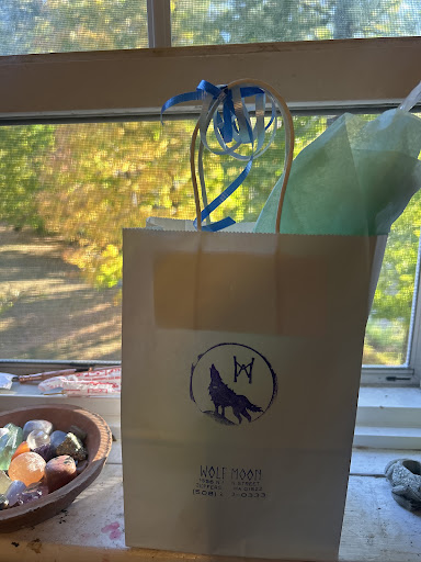 Gift shop with classic seasonal deco, Pagan and Wiccan books (new and preowned), locally made salves, many candles and candleholders, some stuffed animals, statuettes of dragons, fairies, etc.
