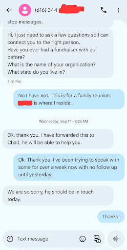 Where is the customer service training in your response? The better response would be to 1)Apologize for lack of communication. 2) Empathize with the customer and let them know that you understand my frustration and let me know that this is not how you do business. 3)Instead of trying to go toe-to-toe with me, like you just did, you should ask if I'm still open to learning about fundraising with the company and proceed to offer a 1-800 number where I can call and speak to someone other than the person I'm complaining about and they can assist me with setting one up. So for your sake, Chad, do not respond to my review. There is nothing anyone can say to rectify the situation. Now if you would have had a better response and actually did something, I would have changed my review and my rating. Google needs to make it to where we can say 0 stars out of 5.