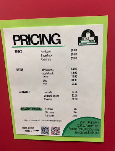 Read moreI love that Holts Summit has a used book store. It is very organized and there are postings up mapping out the layout. What I don’t love is there are no prices listed anywhere and when I asked about pricing when I was checking out I was told $5 for paperback and $6 for hardback. To me that’s a little steep for used books and across the board pricing really doesn’t make sense to me. I also wish there was more signage posted indicating their pricing. At each genre area would be good. Probably won’t shop here on a regular basis unless I’m looking for...