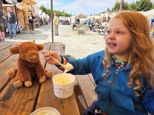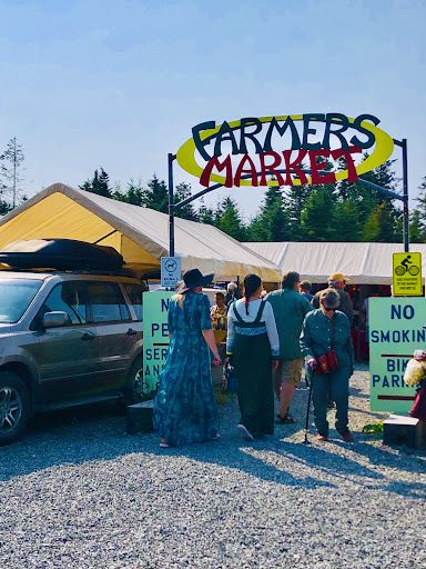 Seafood chowder, oysters, jam, eggs, spinach, coffee, and sweet treats! Seafood chowder from Tamera's Seafood is divine, absolutely divine. The cream broth is delicate, with a sheen of butter?margarine floating on the surface. Not thick like some chowders. Thus, the slice of white bread served with it? Meh. Thin and floppy...think wonder bread. Such exquisite chowder should be served either with a THICK SLICE OF FRENCH BREAD OR crispy, salty oyster crackers instead. Speaking of oysters... Fresh oysters from Jakolof Bay Oyster co. are meaty, buttery, and tangy. AT 2.00 each shucked, go ahead, get a dozen and slurp away-- add a squeeze of fresh lemon or a splash of garlic onion vinagrette and OMG your tastebuds will do the happy dance. The sellers incorporate a single bladed hand shucker, as opposed to other sellers at other markets that use a mechanical shucker. The result is that you'll slurp your treats one at a time, as each is shucked rather than have a plateful handed to you or whatever number you've ordered. And, you may have to wait your turn as the single shucker shucks an oyster for multiple paying customers. Again, I highly recommend a mechanical shucker. Serves more people faster. The Blueberry jam from Bob's is best eaten with a spoon straight out of the jar, or slathered on warm buttered toast. Make sure the bread can support the weight of the jam, however, or you'll just have mess when the bread disintegrates under the weight of the jam. Suggest a HEFTY slice of multigrain wheat bread. Farm fresh eggs from Bob make superb fried overeasy eggs. The yolk is thick and saffron colored. So, a meal of fresh eggs, blueberry jam, and oysters, sounds delicious. Rhubarb lemonade is a buck, but is more like plain pink lemonade. It is made from the water that rhubarb is boiled in to make jam. So, I give the seller credit for making use of the rhubarb infused water. We bought a 1/2 dozen precious notecards decorated with ravens of all colors engaging in crafty raven activities. The seller was an enchanting woman with a broad smile and a willingness to chat. ====Now, you will pay sales tax on the handicrafts. Go ahead pay it, don't whine about it. Some guy---who actually lives in Homer was giving a young sales lady grief about paying the sales tax (2.00--that's two dollars) on his purchase. She was most gracious with this less than gracious customer. The handicrafts are priced as good artwork should be and the tax is what it is. Parking is free, and is a bit of a rodeo. The one way single entrance/exit are NOT well marked. The market is at the crest of a hill on the upside of a curve. Traffic is heavy...(it is summer, and thus tourists like me flock to Homer). We accidentally entered at the exit, and there was no way to back out of it as it would have put us into oncoming traffic. Visibility is poor if you are at the exit trying to exit, especially if a vehicle is entering the exit (like we did) and blocks the view. Thanks to a couple of gracious out going drivers, we were able to wiggle our Subaru between the two cars and slip into a nearby parking space. On the other hand, take a couple of sturdy tote...