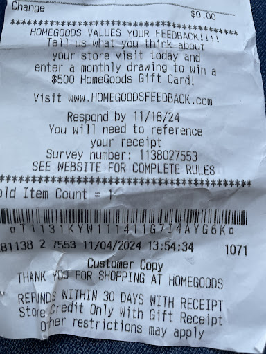 Read moreI’m a frequent shopper of Homegoods/Marshalls chain. This location has great product but the personal isn’t helpful. There is a cashier that might be a lead or manager. I didn’t get her name but she’s heavily tanned. She tries to be friendly but comes off rude and always makes you feel like you’re trying to steal. She questions a lot on returns although you have all the right information. Receipt and all and she still manages to look at you like you’re doing something fishy. I had a transaction with her last night and I think she may need some revisiting of how to...