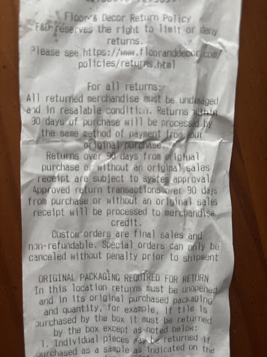 Sunday (mind you 2 days past my delivery) and I go back to floor and decor. No managers can help us. Angel who was there couldn’t give us any answers. He simply gave us the other managers number (none who picked up their phones) and sent us on our way.