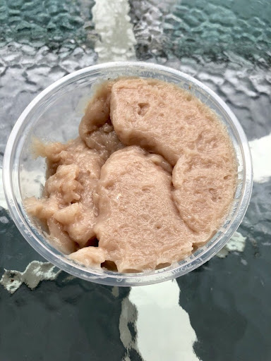 MY PURCHASE: Fish Cake We used to be able to get this on Maui but absolutely no one that I know of makes it any longer. It's basically raw awa fish meat that's labor-intensively scraped off the bone and looks like paste. What we do is season it, chop up a few veggies, mix it together, form little balls and deep-fry them to make fishcake bites that make for a delicious pupu. According to the worker, this is sold only on Sundays and Wednesdays. Needless to say we came on a Saturday, placed an order and picked it up on Sunday.