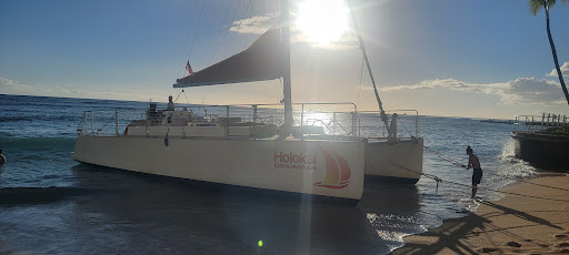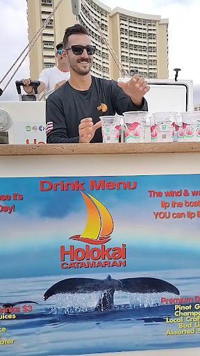 We found this cruise after looking for a sunset cruise that had an open bar with great reviews. We actually booked this cruise online on their website the same day and there was still availability. For the sunset cruise, you check in at 4:30pm at their storefront in the outdoor mall. It is on the second floor and there is a little stand outside their doors to check in. The employee was friendly and checked off our name and instructed us to wait in the area until they were ready to walk over. They also validate your parking at this time if needed. However we were staying in Waikiki so it was only about a 10 minute walk for us. At about 4:45pm we all paraded together with 2 employees over to board the catamaran, it was probably a 5 minute walk through the mall and across the street to the beach. There were around 40 of us in the group. However once we boarded the boat there was enough room for everyone to spread out. The catamaran was beached outside the outrigger reef hotel waiting for us and the other 2 crew members helped us walk up the steps. It is a barefoot boat so you take off your shoes before your board. Once onboard, there are some cubbies by the seats that you can put your things in. It was fun passing by the surfers as we headed out. The bartender/crewmate was super friendly and gave out good vibes. The captain was also friendly and took song requests to play over the speakers. They had 3 different kona beers, bud light, some wine, a champagne, sodas, and then the premade drink which was like a rum and pineapple orange guave juice (POG juice). We set sail exactly at 5pm. Once everyone had their first round, the 2 crew members hoisted the sails and we were off. You can move around however you like. There is a lot of seating in the middle of the boat. Most people stood along the rails on the side. There are two nets up front that you can sit in, however you do get splashed quite a bit up there. You can also sit/stand at the back of the boat where the stairs are, which is where they recommended you sit if you get sea sick/motion sick. You sail up and down the coastline of Waikiki. You get great views of the beaches, hotels, and Diamond Head. The vibes are great with the music playing, the sun setting, the windy blowing, the views, and the drinks. The day we went was quite windy so the ocean was very choppy on the way out as we were going against the wind. You definitely had to hold onto the rails if you were standing up or walking to get another drink. A few people did get sea sick, but the crewmate was extremely helpful and gave them water, told them to sit out the back, and offered them lavender oil to sniff. He also was able to wash the deck if needed. He also checked on them throughout to make sure they were okay. If you prone to any kind of sea sickness, I would not recommend this trip unfortunately, as it is just the nature of the beast of a catamaran on the ocean. Tipping is at your discretion since it is open bar. On our cruise the Kona IPA ran out super quick, so if you are interested be sure to get yours in the first half of the sailing. Exactly at 5:45pm we turned around and headed back, this was a little bit smoother as we were now going with the wind. We got to see the sun set around 6pm ish, and then we headed back along the coastline to where we started. It was cool to see the night lights starting to come on in the city. We arrived back exactly at 6:30pm, so it was exactly 90 minutes that we were sailing. The crew helped us off the boat back onto the beach, and we were set free there. Most everyone walked to the showers to rinse off their feet. Overall I would recommend this excursion as it is one of the only sunset cruises with an open bar, and one that lasted the longest at 90 minutes. Sure it is a little pricey for what it is, but it is in line with similar excursions in the area. The crew was very friendly and welcoming and it was a neat experience to be sailing on the ocean for a beautiful sunset and a...