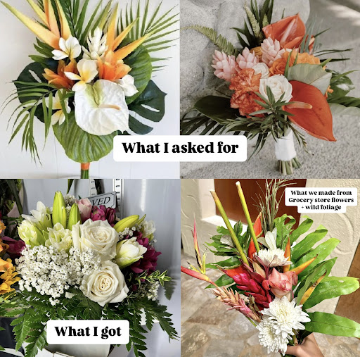 This place had great reviews so I called on Monday for a simple, tropical bouquet in mostly white with peach/orange, to be picked up the next day for an impromptu photoshoot to celebrate our elopement. The florist asked for pictures of what I wanted, and after I sent them, she excitedly said could do something close to that. I paid $200 for this bouquet! The next day, she texted me and said she would do her best. I was fine with that. So I get there to pick up the bouquet, and it is nothing close to what I asked for. It's huge, no tropical flowers. It has no peach or orange, but it does have purple?? It looked like a funeral arrangement. Who died? Normally, I would've just accepted it and left, but I paid too much for this bouquet for it to be the wrong color, size, and type. I texted her and said I'm sorry, but I couldn't accept the arrangement. No response. I had a photo shoot an hour away in less than 3 hours that I still needed to do my hair and makeup for, so I texted her 5 more times and called her 3 times. No answer. I know she was there, too, because she told me she would be there until 2:20 & it wasn't even 2:00 yet. I finally left because I couldn't afford to waste any more time, and she calls me 5 minutes after I leave saying she told me she couldn't get tropicals on that short notice (she didn't). I didn't want to argue because it was over at that point.