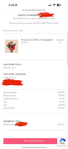 Read moreI brought my boyfriend to Honolulu for his 51st birthday. It was his 1st time there so he really wanted to get "leied". I called the Honolulu Flower Lady from my home in cold Idaho and her voice on the phone was warm with Aloha. She "leied" out the options on the phone and I made my selection with a back up plan in case the plumeria were sold out. I was assured the Lei would be delivered and easily paid over the phone. The day we were to arrive, flower lady texted me that they were out of both of my selections but were getting restocked at 7 pm and wondered if that would work with my time frame but offered another option at no additional charge in case not. I told her that would be fine as we wouldn't arrive at our hotel until 9 pm. At 8:50 she texted me that she was on her way. We were able to meet her in the lobby and receive the Lei in person. She even worked after hours in order to deliver. My boyfriend was really touched and the Lei was beautiful and fragrant. The Honolulu Flower Lady had incredible communication and customer service. She helped make my boyfriend's birthday...