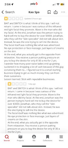 My first appointment with this company I booked the facial special that was advertised through Facebook. I do other types of self care treatments all the time so I wanted to try this place out because I thought it was a good deal. After my appointment I felt pressured as I was given some tea and then they had me watch a video of their device that they use for the facials. I was assured that for $1200 I would get 10 facials and some of their products to use at home and they would capture the process of my skin change. I was told that once I leave I was not allowed to get the same deal and so I went ahead and took the deal and booked my next appointment. $1567.50 for the facial package and $73.14 for this facial spent that day and then on march 5 I called to confirm my appointment for March 7th and no one got back to me. When I called again they couldn’t even find my appointment let alone first and last name in their system. They then tried to make it up to me and my second facial with them was done by Maria and she was actually really great and I saw a big difference from my facial with her. But now I haven’t seen her there and didn’t get her my other two times but after being rescheduled/appointment not found for the third time I’ve found that I’ve just been scammed out of over $1500 as I only got 3 out of 11 facials and at this point there’s nothing left for me to do but give others a warning to beware of this company and their sketchy practice. They just want your money upfront and then make it impossible to have a good experience after you’ve already given them your money and instead expect you to give them more (tip, parking, time). Don’t get scammed their facials are not worth it and once you give them your money they’re...