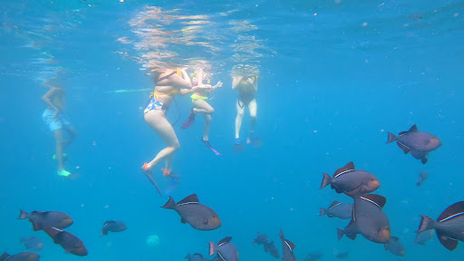 (2) The snorkeling itself! I had never gone before and was pretty nervous, but Nyle was a really confident and patient teacher. She supplied snorkeling gear (including defogging spray), flippers, and wearable floaties, which were a big comfort to me to start out with. (After a while she said to me that I looked like I would be okay to go without them, and when I took them off at that point I found that she was right -- so I'm grateful for the mental comfort that they provided in the beginning.) In our group of five, one of our number was less confident about swimming around by herself, and Nyle actually guided her around by hand for the entire tour. I was really impressed by her adaptability to our group, and how she was such an effective guide for ALL five of us. She is so nice, she explained everything so well (how to breathe, how to go from floating to standing on the sand in the flippers, etc.), and I just had an AMAZING time. The fish were so big, so colorful, so numerous, and so close (like pigeons! haha).