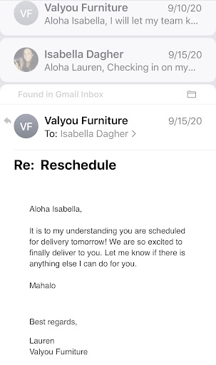 After paying for everything on their website which by the way is a breeze to navigate and the furniture on the website seemed to be updated constantly to assure you that what youâre buying is definitely in-stock or not, I received an email from Lauren over at the shipping and delivery department requesting to set up delivery of all the furniture I just purchase only minutes earlier.
