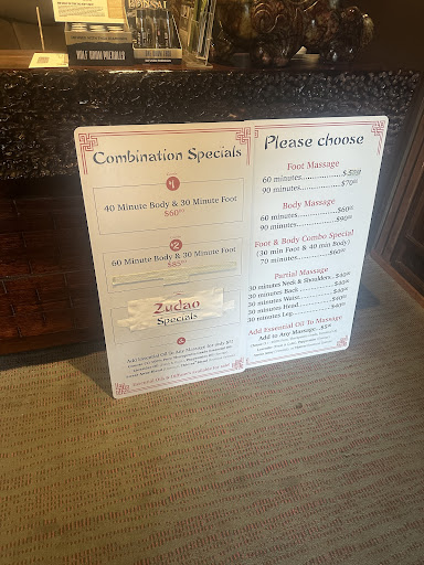 Read moreFrom start to finish a 5 Star experience! I walked in & was immediately welcomed by two beautiful ladies at reception. I did not have an appointment. I chose the 70 minute combo massage for $60.00. It was incredible! I love deep tissue massage & it was perfection. Zudao is clean & the massage tables are so comfortable. The massage began sitting up soaking my feet in warm water with a neck, shoulder, arm massage and stretching. After this it was over to the super comfortable massage table for a full body massage. It started face down then face up. It included some awesome stretches. It finished with the foot massage while laying on the table. On exiting I received a bottle of water & they even had a big bowl of Halloween candy. Super cute touch. This is a great place to buy gift cards for the holidays. Who would not love this as a gift. I cannot...