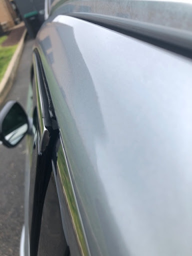 On the drive home my wife called me from the vehicle and reported that there is a strange wind noise from the driver's door. Upon inspection the driver's door top right corner was found bent outward creating a sizable gap that allowed wind and rain to enter the inside of the vehicle. (See photos) There was also a half inch horizontal scratch in the upper right corner of the door.