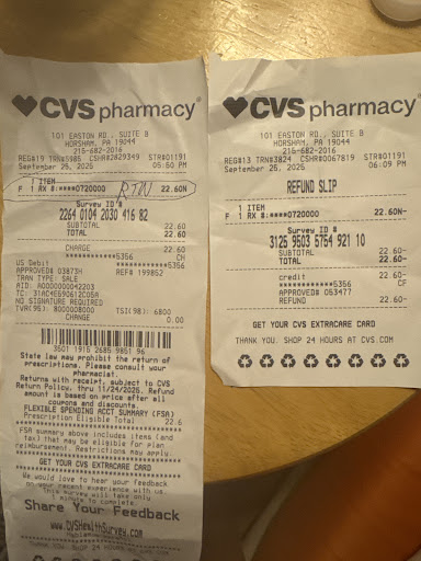Hello. For more than 15 years, my husband and I used the services of the pharmacy in Horscham at 101 Easton rd 19044, there were no problems. We are 70 years older people. I stopped at Drive thruway on September 25 at 5:45 p.m. to pick up the order. There was a queue: a few cars in front of me and a few behind my car. Our family doctor sent a prescription for Metronidazole 1% cream. Since there was quite a queue, I paid, signed, received the package and drove away a few metres from the window so as not to delay the queue and stopped to read if they packed me cream and not gel. The bag was labelled gel. I picked up this package at 5:50pm. I got out of the car and went into the centre of the pharmacy. Near the cash register stood a small older gray-haired man who served the patients of the pharmacy. I went over and said I needed a cream, not a gel. The doctor ordered a cream over the phone. This cashier was very aggressive and angry, started shouting loudly at the whole pharmacy that he could not take back and that they had no cream, only gel. He shouted a lot that he couldn't take it back, but he would do it for the first and last time. I was very worried and already began to apologise for that fear and said that I went straight from the window into the middle of the pharmacy. Everyone looked like a miracle, because he screamed for about 10 minutes, then an older woman (probably a pharmacist) came up to him and also added a scream. I stood there, apologising, although I didn't know what my fault was. Couldn't this question be solved calmly? If he said that I can't take the unpacked package back in a calm tone, everything would be fine. It's the first time I've been in such a situation and I think it's not normal at all, because people who have health problems come to the pharmacy, and from this attitude they get severe stress. When I returned home, I burst into tears, my blood pressure and blood sugar were very high, I got a lot of stress, because I am 70 years old. My husband and I moved to another pharmacy. It is a pity that unbalanced people work...