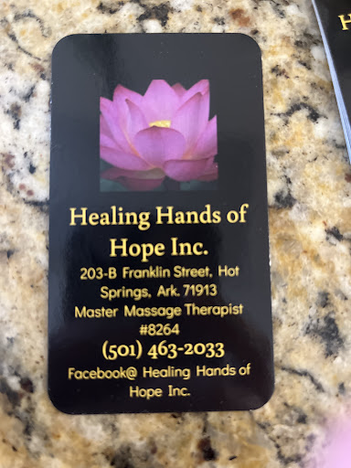 Read moreAfter doing extensive research online to find the best Massage Therapist in Hot Springs AR., I found the Healing Hands of Hope. And I am overly thankful I found Hope. She exceeded all my expectations and made me very comfortable and at ease as soon as I walked in the door. I have received many massages over the last 60+ years I have been on this rock. Let me tell you, you will not be dissappointed! Hope is very knowlegable at her craft, listens, and is very easy to talk to all while relieving all your muscle tension and stress. I left very happy and will recommend her highly to my friends and family. And as for myself, I am now a client of Hope's for life. Thanks so much...