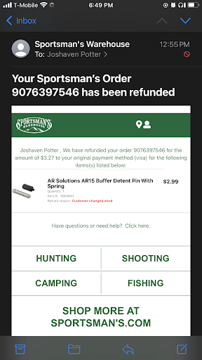 It's not wonder why the store is rated 2.7 stars out of 4455 reviews. Yelp. Bought and had a carbine sent to the Hot Springs, AR store. They close at nine. I go to work at ten and left early to pick it up. I showed up to the store between seven forty five to seven fifty five. The gentleman at the counter was on his phone and was nice enough to lower it to acknowledge me. I told him that I had received a email letting me know that the rifle was ready for pickup. He told me that they were getting ready to close and wouldn't do the paperwork. Not happy, but OK. Stayed at work late and went and had an awesome breakfast at ihop while waiting for store to open. Get to store, paperwork and approval took all of fifteen to twenty minutes. Look the rifle over and will admit that I should've turned the box around and apparently read the manual, because I didnt notice the charging handle wasn't there. So, called the store, automated message, no problem I'll wait. Cashier answers phone and states that he knows I called hunting and that he was busy and I could call back or he could put me on hold and hope they answer. I kid you not, that's some customer service for you. Hey, hunting answered, guess my luck is changing. I tell the manager what has happened and that the manual stated that there was supposed to be a sling and a charging handle. I couldn't care less about the sling ,but to those that may not know, a charging handle is kind of important to a semiautomatic firearm. Hard to get bullets from the magazine to the chamber on this particular firearm without one. Guess I could've jammed a stick or something in it. But I digress. Im then asked if I would mind being placed on hold. Sure ,why not. I then after a good bit get this "manager" back on to proceed to tell me that he couldn't find in his computer were it said it came with a sling...........sorry, I lost it. He told me to bring the box back in so they could look. OK, im getting older, im not one to say I haven't overlooked my readers while they were on top of my head or misplaced my keys, but, im pretty sure im not a total idiot. Im sorry if you read and suffered through this. I just try to explain what I have dealt with to hope that some of those not in the 2.7 percent have to deal with it. Please no auto response needed sportsman warehouse. Your store service and customer support say enough. Thank yall. PS- Midway USA and Bass Pro website may be good to check out before going through this fun.