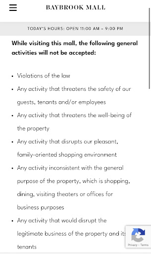 On August, 2nd around 7:50 pm our children who were playing soccer were approached by 2 white security guards, one was a young chubby female with dark brown hair and the other was a bald man, and they came to prevent them from playing as apparently there is a “rule” saying soccer or playing with a ball in this place is only allowed for kids 5 and under per the female security guard statement. I spoke to her as I didn’t want her to talk to the kids, and when I asked when this rule was in place, she stated it’s explained in the “ Code of Conduct” displayed by the entrance of the mall and online. (see the attached image, showing nothing such as this claim is true on their website)