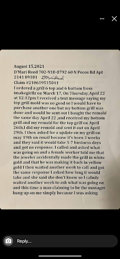 Edit: response to the owner! Absolutely nobody is upset that you cut me off from doing business with this unorganized company. Obviously this isnât the first time this has happened with one of your customers. And Iâm going off of what Iâm TOLD DIRECTLY. PLUS, I tried to pay as soon as the mold got there but AGAIN was left with no text/call back so if I did paid after hours it was no fault of my own! I ALSO FORGOT TO MENTION YOU DID THE GRILL COMPLETELY WRONG THATS WHY I NEED A REFUND. How could you get the design wrong when I sent you a picture specifically detailing what I wanted. And if you had any questions regarding the design you shouldâve reached out to me. Thatâs COMMON SENSE!!! But obviously you guys are lacking in the area as well. Like I said before there are MILLIONS of other manufacturers to process my orders and take care of my needs, so no I am NOT upset about that. Iâm not one of those many customers youâve had thatâs just going to lay down and take your bs. AND the package WAS NOT shipped out on WEDNESDAY anybody can see with the tracking number you provided that it was actually shipped that FRIDAY, the 29th. So now with that being said the holiday had NOTHING TO DO WITH THE DELAY OF SHIPPING. The label was created on Wednesday (the 27th) but WASNT accept your USPS until 2 days later. Do not play me like Iâm stupid. How come you provide evidence and STILL end up lying?! Just admit you were wrong, refund me my money, and the situation...