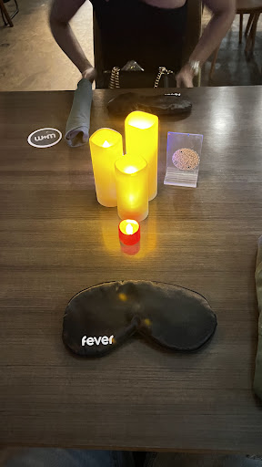 This experience is absolutely not worth the price! Our first dining in the dark experience was at Blackout in Vegas, which was absolutely incredible, so we came in with high hopes! I booked it without reading (my mistake) because I thought they were the same company. I was super bummed to realize we were going to be using blindfolds. I hate the feeling of blindfolds, so it was irritating, and it kind of makes the experience pointless. You could literally just put a blindfold on at any restaurant. Don't come with an empty stomach because they don't serve the food until a while after you're seated. My boyfriend and I both got the green menu, the appetizer was fine, we both hated the main course and only ate a few bites. The desert wasn't great, and I was unable to eat it because I couldn't break it up (it wasn't supposed to be like this. I just got unlucky). Either the eye mask or the napkin had the smell of when you leave something in the washing machine for too long, which was really unpleasant. The drinks were also very expensive and very bitter. Apart from the food being disappointed it was very plain, I feel like part of the fun of these restaurants is guessing the food but using a food in it's normal form makes it much less fun and takes away from relying...