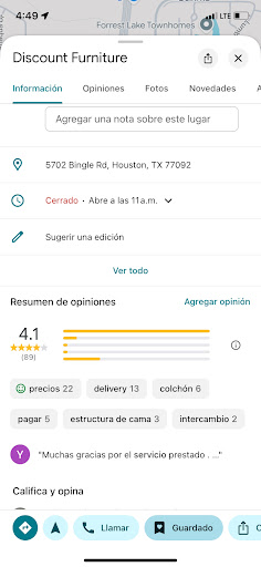 I brought Furniture at Discount Furniture on 5702 Bingle Rd, Houston, TX 77092 The Bed Broke from the Frame. I Called Them to Ask If They could help me with my Situation. They We're so Nice When I first brought the Furniture. But Don't let That Cheap Furniture Break. They we're so rude. They told Me That I Couldn't return it, and Didn't offer Any Solutions. Advice don't break them Off No Money for their furniture, because their Furniture will Break on you.