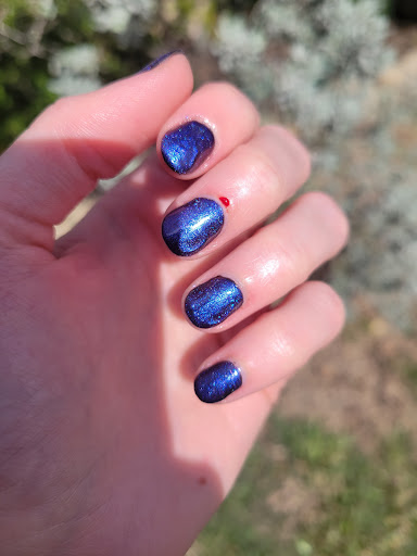The lady was rushing my manicure, and instead of starting on my right hand that was soaking in water, she began working on my left and ended up cutting three of my fingers on that hand. The color I chose ended up not being as accurate as the sample, but the nails themselves still look okay, despite some of them being cut at different lengths. The entire time this was going on my husband was sitting there waiting with his feet soaking in room temperature water, but no one ever came to work on his pedicure even thouggh there was literally only one other customer in there. We ended up leaving once my nails were done and will not be back. My cuticles are sore in multiple spots and one of them won't stop bleeding, it looks bad. Edit: Added pictures of my nails less than 5 days after I got them done. Chipped polish, extremely dry skin all around the nails from rushing my manicure and dry blood spots from where I got cut...