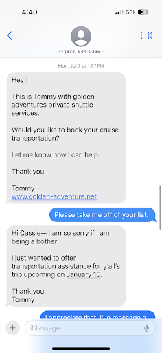 I reached out a few weeks ago to get some pricing for some transportation for a trip we are planning in January. They were super responsive and gave a good rate. We are still planning what we are doing and when we are coming in for sure. I let the person I was texting know and that we were interested but it would be a few weeks before we could nail any plans down. They were fine with that. They then followed up a couple days later. I reiterated that we were still planning and I didnât have anything solid yet. I let them know I would reach out when I had more solid dates and times. Again they were good with that. A couple days later they reached out again. This time I was a little more stern that I didnât have plans yet and that I couldnât booked right now. I would reach out in a few weeks. They said they would note it. A couple days later I received another follow up the same as the rest. I finally said I wasnât interested and no one was listening to my messages. I asked to be removed from their list. 3 days later the same follow up message came in. I was shocked. I screenshot the previous message and asked to be taken off of their list again. I explained that the follow ups are overwhelming and nor one who is messaging me is actually listening to me and/or notating my account. That person apologized and said they would remove me. Today I got another follow up. 7 follow ups in a month is RIDICULOUS and NOT customer service. I work in sales, and this is crazy!!! If you donât book immediately they will bombard you. I finally blocked the...