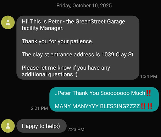 I did call Clay Garage Parking before calling Green Street Garage Parkingwho told me informationNOW I'm making a second call having Parking Garage Customer Service experiencekeep this in-mindbecause~