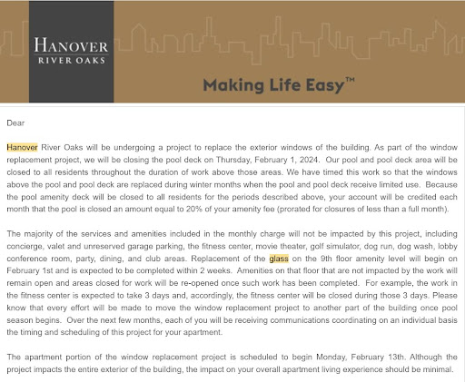 Read moreI am very sad to write this review. For the first year of living at Hanover River Oaks, it was a dream. Beautiful views and a really great building....but then about a year ago, the staff turnover started. They went from being a resident focused group that went out of their way to take care of the people living there to a group that seems more concerned about saving pennies while they lose dollars. The rents are very high (which are appropriate for the building), but sadly, not for the service part of what you are paying for. They continue to lose good employees and I am quite sure they will lose the last good ones soon as they have expressed their frustration to me about the current climate. The straw that broke the camel's back was my interaction on move out. I had decided to move to a house and so gave my notice. I was told at move in that picture hangars and such are normal wear and tear. Only a hole larger than a nickel was chargeable. So like most people, I hung a few pictures. When I moved out I cleaned the apartment. All they needed to do was basically paint and it was ready for another tenant. After move out I was sent a bill for $115 for sheetrock repair and a scratched cabinet. I requested photos and they sent me photos of the picture hangars and a very minor scratch. This isn't about the money. It is about the petty attitude of the building now and the fact I know and was told that standard industry practice is not charging for minor picture hanger nail holes. I had been a very easy resident for them. In fact they are replacing allllll of the windows on the entire exterior of the building due to them falling out randomly (if that doesn't scare you about the construction I am not sure what will) and they sent me a request to be out of my apartment for a day so they could do the work. I travel a lot and that was literally the only day I would be able to be home for nearly a month. I requested a different day due to that but they said no. I didn't argue or complain. I simply said ok and then had to go to my apartment in the middle of the night to change out my clothes and do laundry for a trip. I accommodated them to make it easier.... I can't say they returned the favor. I contacted the office to request that they not take the little bit of money out of respect. I didn't ask for compensation like other residents did for being put out of my home. They ignored me. Pretty much tells you everything you need to know. The building has become toxic and I have already spoken to several other residents who are ready to move. Good news is that more apartments will be available to those of you that don't heed this warning..... Good luck.