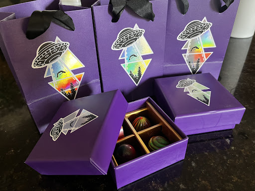I initially discovered Interstellar Confections because a coworker brought a box of assorted, space-themed chocolates to an event. Everyone was instantly invested in studying the chocolate key card and carefully selecting their confection.
