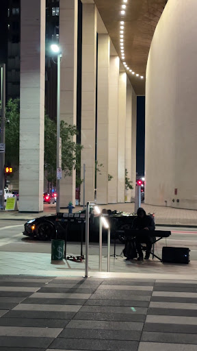 While visiting the building there was a pianist playing in the front lawn of the building, so we sat at the seating area and enjoyed the music. The Houston skyline that you see while driving, the tallest building that you can see on the side is the JPMorgan Chase...