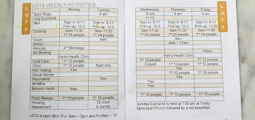 Call or check the website for all the services. They have a clothing room, toiletries, a medical clinic and more. Ask for the small handbook of homeless services in Houston. LOTS is an Episcopal church and spiritual support is...