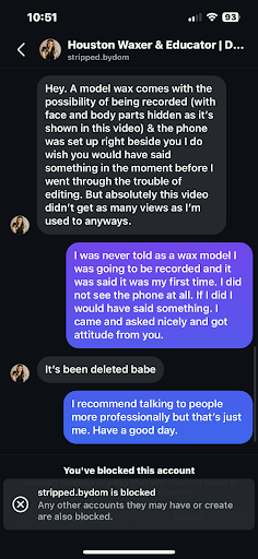 Ā Ā Ā Read moreWent to be a model for a friend that was training in Brazilian waxing (friend was amazing the entire time). Me and my friend both informed Dom that I have NEVER done this before nor have been a model. Appointment went fine. I wake up the next day and see a video of my waxing appt. You can't see my face and my private area, but you can still see my identifiable tattoos. Either way, I knew it was me and I was NEVER told that as a model I was going to be recorded. Never signed anything or gave verbal consent. I kindly asked Dom to take the video down and was met with nothing but attitude. Was never going to write a review, and I don't ever write reviews, but the attitude and...