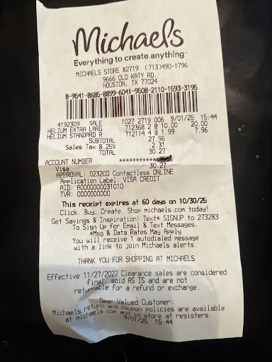 Read moreWe went to the Michael’s at 9666 old Katy Rd to have 2 large number Mylar balloons plus 4 latex balloons blown up. When blowing up the balloons with helium, the number 0 balloon escaped the employee and drifted up to the high ceiling. They used a separate latex balloon with tape to get the escaped ballon down. That first latex ballon hit the ceiling and popped. So then the employee tried with a 2nd ballon but used a stronger type of tape. She got the number 0 ballon down but it had deflated some. They told us the air probably leaked out of the blow up hole because they hadn’t fastened it tightly enough. They opened the balloon up and added more air. I suspected that the Mylar balloon got a hole while up hitting the ceiling or rafters like their latex ballon had popped up there. Anyway, we left, but I kept an eye on it while driving home. In less than 10 minutes, the Mylar ballon had deflated approximately by 1/3, do we did a U-turn and headed back to Michael’s. This time, an older male employee assisted. When we left, he made an inappropriate comment that we shouldn’t leave the balloon in the car as if it were our fault rather than their fault. We literally were back on the store within 15 minutes from when we left. We paid $30.37 for the helium alone. We waited an extended period while they attempted to retrieve the balloon that escaped them from the ceiling. But the worst part was having to make a trip back to the store to have them replace the Mylar number 0 ballon they damaged when it escaped them to the ceiling. Plus we brought our own number Mylar ballon’s in color black, but Michael’s doesn’t stock. Lack, so they replaced with silver balloons which we didn’t want but had no choice because the bday party was to start in 1 hour. The make older employee was not apologetic at all for the trouble caused and seemed to be accusatory. We should have been offered a full or at least partial refund or gift card or something—or at least an apology rather than the accusatory remark. Michael’s store #2719,...