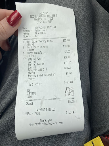 Ā Ā Ā Read moreIāve been to this location two times, after the second time I wonāt be back unfortunately. The first time I went I got a manicure and pedicure, which I loved. So I came back a second time two weeks later with a friend to get a polish change. I was picking a color when a man who worked there came up to me pressuring me about shellac. All I heard was shellac, shellac, shellac, I couldnāt even focus on what color I wanted. This seems to be a problem as well, I donāt want to talk during my service and I indicate that clearly . I was brushing him off and he persisted, literally shouting over my friend who was on my left trying to help me pick a color. Same happened when I was actually having my nails painted, the tech kept talking to me. I donāt even know what shellac is, turns out itās gel. Iām like why didnāt you just say gel. I didnāt intend on getting gel but I decided to because it lasts longer. Or so I thought. I got gel polish on my fingers and regular on my toes, 4/30/23 exactly a week ago. My entire gel manicure is gone! Cracked, peeled and popped right off within a week. My toes however are fine with the regular polish. I will not be back, gel should last much longer than a week, especially since they charge $25 to add gel alone. Not to mention they overcharged my friend for their services but thatās a different story Iām not here to tell.