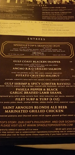 Ā Ā Ā Read moreA beautiful view with a warm, attentive staff and food that only missed a single mark. We had dinner there for our anniversary last evening. We were very promptly seated, even though we arrived a bit early for our reservation. The view is spectacular, and it was a great evening to enjoy the sunset. Our cocktails were delicious, and we quite enjoyed the bread basket. Our server was personable and cheerful. She did a fine job all evening. We shared and enjoyed the seafood mac and cheese- a generous serving full of perfectly prepared shrimp and crawfish. My husband had the corn seafood chowder and I had the fresh green "Spindletop"salad. Both were wonderful! I had the rack of lamb and was delighted with both the execution and the presentation of my dish. My husband had the surf and turf, giving the filet one of the highest marks he's ever given. The one misstep on the menu was the overly dry crab cake accompanied by an overpoweringly strong citrus sauce. It was a shame because the crab cake was full of good looking lump crabmeat, but was just off the mark. We were greeted during our dinner by the restaurant manager, and the chef came out to introduce himself as well. We could not have had better service. We declined dessert, as we were simply too full, yet they presented us with a lovely complimentary anniversary dessert plate and a hand written Happy Anniversary card signed by all the staff. If this effort does not indicate the desire of a restaurant to attract and retain clients, I don't know what does. We shall return. It was a...