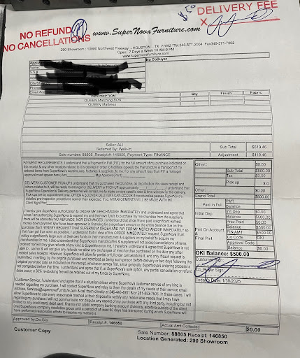 Super Nova Representatives pushed a House Brand Mattress and Box Spring, a brand I never heard of. So I gave it a chance. But when I went to pick it up from the warehouse, I see why Super Nova has customers sign a Purchase Order, before going over the Okinus Contract or receiving the product by Delivery or Pick-Up. Super Nova has you sign a No-Refund Purchase Order, because the product is cheap and poor quality.