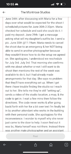 Working with Maria has been the worst experience of my life. When I met her I asked if she could do photography for me but she told me that she offers event coordinating services. So I trusted her and I gave her money to do this service for me. Here is what happened: Day of the party, the party was not set up by the time that guests were arriving. So I had guests waiting around while she continued to set up. She ordered plates of a different color than the color that we agreed on and I had to pay 450 dollars day of for them. She didn't return the stuff to the vendor and she broke one of the cake stands so I had to pay an additional 50 dollars. I paid for curtains and she lied to the events place and told them I dont want curtains because it will mess up the pictures. She tried to take money from other vendors (moon bounce etc) and do free services for them instead of paying them what was due. She lied to me about what she was buying and doing with the money. I paid her 700 dollars for pictures that she still has not given to me yet.
