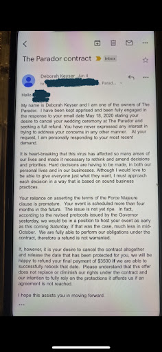 Deb said we were not entitled to a refund - BUT - if they could rebook our date (in the midst of Covid), she would be kind enough to refund us 1/2 of our deposit ($3,500). Apparently, the global Covid pandemic did not satisfy Deb’s interpretation of the contract’s force majeure clause.
