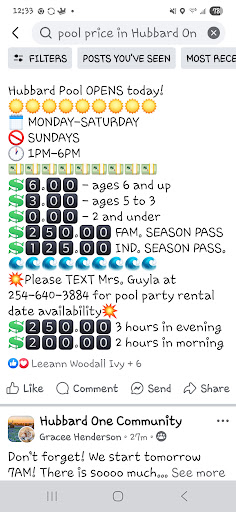 Very few small towns like Hubbard have a city pool. Thanks to Dave and Guyla for keeping this one in operation. The shower and toilet rooms need maintenance and I wish they had a higher diving board, but the higher board probably raises insurance liability issues. I'll always be back for the...