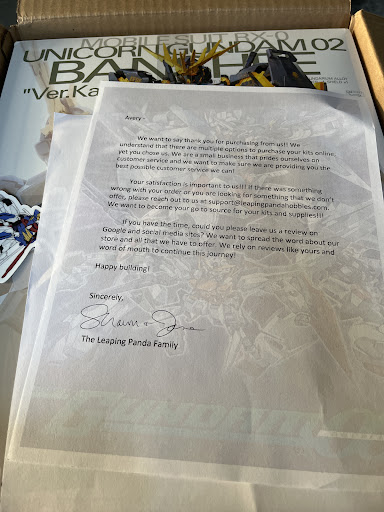 Read moreLPH is at the top of my list for Gunpla and accessories. When I'm looking for my next kit, I start with LPH. Get on their mailing list. A must, must, must. You'll feel like an insider with weekly restocks and there's always a killer promo going on. Rewards program? You bet. Prices? They are no joke. Sorry, The Gundam Place Store, I love ya, and you're my side piece, but LPH prices are just too good on my wishlist items. Service? 5 million stars!! I don't personally know the shop owners but between the "thank you" letter, free LPH sticker, great packaging, fast shipping, and an occasional surprise gift, I want to support them 100%. They're committed at the core. Have an issue with an order? They will make it right (personal experience). Looking for a specific kit or restock? Just ask using one of many platforms (Instagram, Discord, email) and they'll get you the info. Plus it doesn't stop once the closed sign is flipped. They also give back to the Gunpla, Warhammer, and TCG communities with in-store hosted events. I'm hoping one day I can visit the store in person and meet the owners. Thank you, Leaping Panda Hobbies, for...