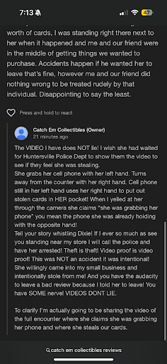 Edit 2! after the shop posted the video of you came to see my comment hi! the reason my sister was texting my mom is because she was in the hospital with a brown recluse spider bite, I would post pictures but thatâs gross lol, also if you read my review you can see where I wasnât complaining about him telling her to leave or accusing her of stealing, we all know that she didnât have any ill intentions, the shop doesnât thatâs fine, my review was because of how they continued to let her stay open packs let us purchase $100 worth of products and after we spent $$ they told her to leave. WHICH THEY DID NOT SHOW IN THE VIDEO!! is us purchasing packs, cards, and boxes!!! anyways whatâs bad about the shop is bald man being rude to the gal in pink after my sister apologized and happily left. Craziness!! I am the girl in black in the video I am the one who left this review!! here are photos of the shop calling me the b-word on their social media, mind you i purchased products from these people.. i not once did anything that was remotely close to stealing! i had nothing to do with it so calling me the b-word is insanity after I wrote a honest review! also the owner deleted their reply to my first review which I also will include photos of now