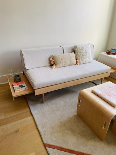 When my sofa arrived, I was blown away. It looks even better in person—gorgeous clean lines, beautiful wood detailing, and the fabric feels so luxe. It’s also really comfortable, which I find is hard to find with modern pieces.