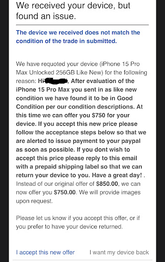 Found them on a website and filled out to what I felt was the accurate condition and was offered 850$. I got this offer 1 week before the iPhone 16 drop. I sent the device the same day as the drop. Apart of me feels like they didn’t want to honor the offer because of that new iPhone release and now there website only offering 700$ for that phone after iPhones released date. However After sending it in I got an email stating they felt the condition was different and the new offer was 100$ less. My biggest issue was there was no description on what was so wrong with my device that cost me to lose a whole 100$. However in the end I accepted the new offer of 750$. I got an email stating the money would be deposited through PayPal. 3 days go by and no deposit. I called them and spoke to a manager who was very nice and assured me it would get handled that day. Which later on in the day a lady called me and found out someone entered the wrong email on there end which is why I never got my deposit. She assured me it would get fixed that day and it did. However when the deposited the 750$ there was some fee where I lost another 22$ smh. So I lost a total of 122.43$. The only reason I chose a 2 star instead of 1 starts was because of the two people I spoke to. They both were very nice and understanding and wanted to help me get whatever funds...
