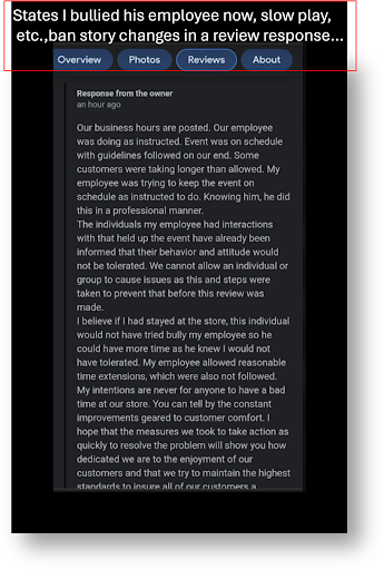 By comparison, High Ground Hobbies is much friendlier and has excellent food, on top of all the sealed or singles you could want. Recommend them instead. 1/5 stars due to JC's store owner’s possibly unethical decision-making, sour disposition, and shoddy customer service as noted in other reviews. The owner possibly even banned me for giving a review he didn’t like, walking back his story numerous times in the process since this occurred, as SS's showcase. While I normally give stars for the positive amenities in a store, the overall attitude of the owner and the incredibly negative environment he creates make it a 1-star for me due to his abysmal attitude. The atmosphere is palpably different when he is in a room. He even went flying into another store recently to publicly complain to owners when they scheduled an event at the same time as one of his events. This attitude is cancerous for the local gaming community as a whole. I initially gave this store 5/5 stars years ago. I then changed it to 4/5 stars after a few visits and simply stated that the owner was very short in interactions. I continued to show up, advocate for its’ good points to my friends, and spend my own money there regardless. I still did, until today; I will never again do so and sincerely hope you all make your purchases online or go down to High Ground Hobbies, which I recommend. I tried to sign up for an event long after the fact and was denied. Why? Fast forward to the Sealed Baldur’s Gate draft event I attended on release, which supposedly led to the ban. I had a new player in my pod. Our pod finished drafting last due to this player. I helped him out with his deck building and the draft process overall since he was new, which took a lot of time. We were then told our tables by the organizer; I picked up my cards as fast as I could, as did the rest of the pod, but again, we only had just finished drafting. Out of the recommended time for sealed deck construction (MTR Appendix B — Time Limits: Sealed Deck—20 minutes for deck registration and 30 minutes for deck construction) we had less than 10 minutes flat to work with, and my whole pod had to scramble as a result. For Prereleases and sealed deck events that take place on the weekend of a new set release, 15 additional minutes for deck construction is recommended, by the way. The employee running the event was talking to a girl at the counter. He ignored me until I hailed him multiple times, then was slow to check me out. I returned to my seat, had no time to use the sleeves I bought, and moved to my pod as quickly as possible, taking less than three minutes to do so. Nor was I the last player to be seated in my pod alone, let alone all the other pods. We began to play before most other pods, so the claim I slowed play was ridiculous. I hailed the organizer twice unsuccessfully, and on the third time got his attention and let him know that he should start the timer since everyone was playing; he was too busy talking to the aforementioned girl to notice. This was enough to have the organizer messaging the store owner due to what I can only perceive as a fragile ego. I received a DM the next morning from the owner stating I was unwelcome at future events. I responded to ask why. The story changed constantly; it started as being a “problem”. Then it was "slow play", "holding up the event, and later “bullying”. In one DM, the owner stated he was “gonna give the benefit of the doubt” after "talking with my employee”. Then a person named Luke left a 1-star review. He doubled down, possibly insinuating that Luke was a friend of mine. His tune changed completely from considering lifting said ban. He was potentially trying to create whatever narrative he needed to fabricate a moral justification for a ban, solely based on Google Reviews he didn't like about his store. Finally decided to change my 5 to 1 today as a result of the ongoing ban for things I never did. Jeff doesn't enable a fun gaming environment, no matter how much $ he throws at it. Hope you enjoyed...