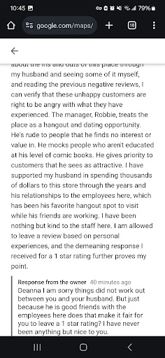 Read moreI see the owner responded six months ago to a review that was over 4 years old. I actually remember when that review was written. There were maybe two or three total Google reviews of the store at that time, but immediately following the negative review, there was a sudden influx of 4-5 star reviews. It was blatantly obvious they had asked their friends to boost their rating on here, which is kinda' shady if you ask me, but not at all surprising considering the type of people who work and regularly hang out there. I don't know why they were so intimidated by the negative review, as there isn't really anywhere else to buy comics in the area.